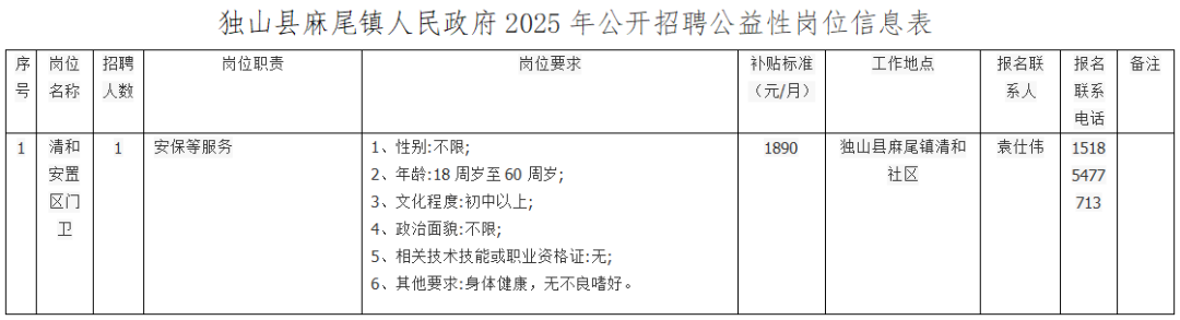 本次公益性岗位计划招聘1人,要求年龄在18至60周岁,具有初中及以上学历。具体岗位名称、岗位职责、岗位要求等见《独山县麻尾镇人民政府2025年公开招聘公益性岗位信息表》(附件1)。